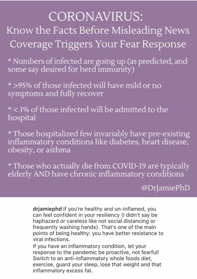 It’s so important that we don’t spread these as facts. “Dr. Jamie” is a naturopath. No disrespect to that industry, but for coronaviruses let’s adhere to science.