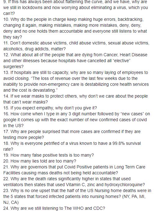 9. If this has always been about flattening the curve, and we have, why are we still in lockdowns and now worrying about eliminating a virus, which you can’t?